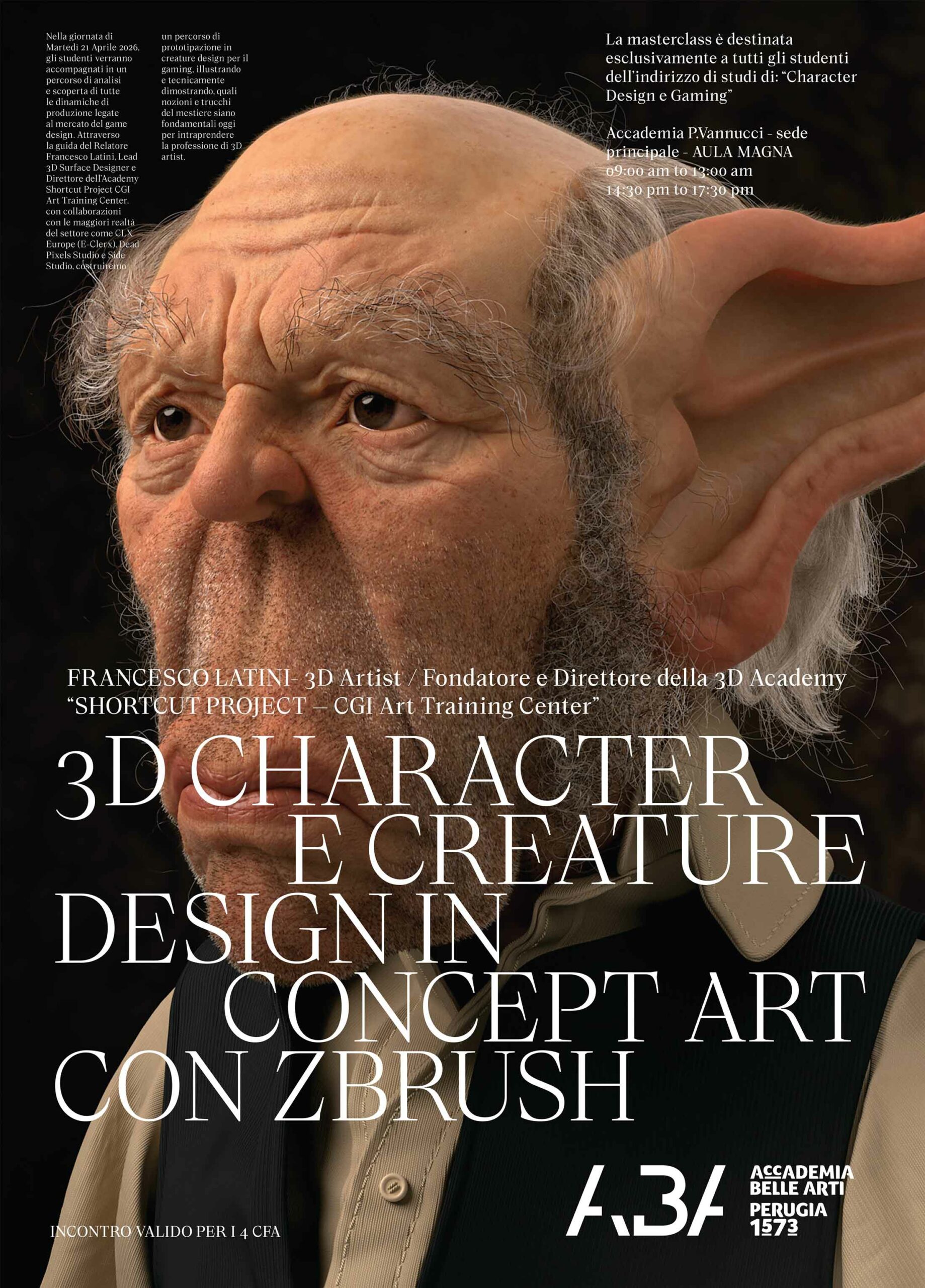 Martedì 21 aprile 2026 presso l’Aula Magna dell’ABAPG, gli studenti del corso di diploma di primo livello in Character design e gaming verranno accompagnati in un percorso di analisi e scoperta di tutte le dinamiche di produzione legate al mercato del game design. Attraverso la guida di Francesco Latini costruiranno un percorso di prototipazione in creature design per il gaming, illustrando e dimostrando tecnicamente, quali nozioni e trucchi del mestiere siano fondamentali oggi per intraprendere la professione di 3D artist.