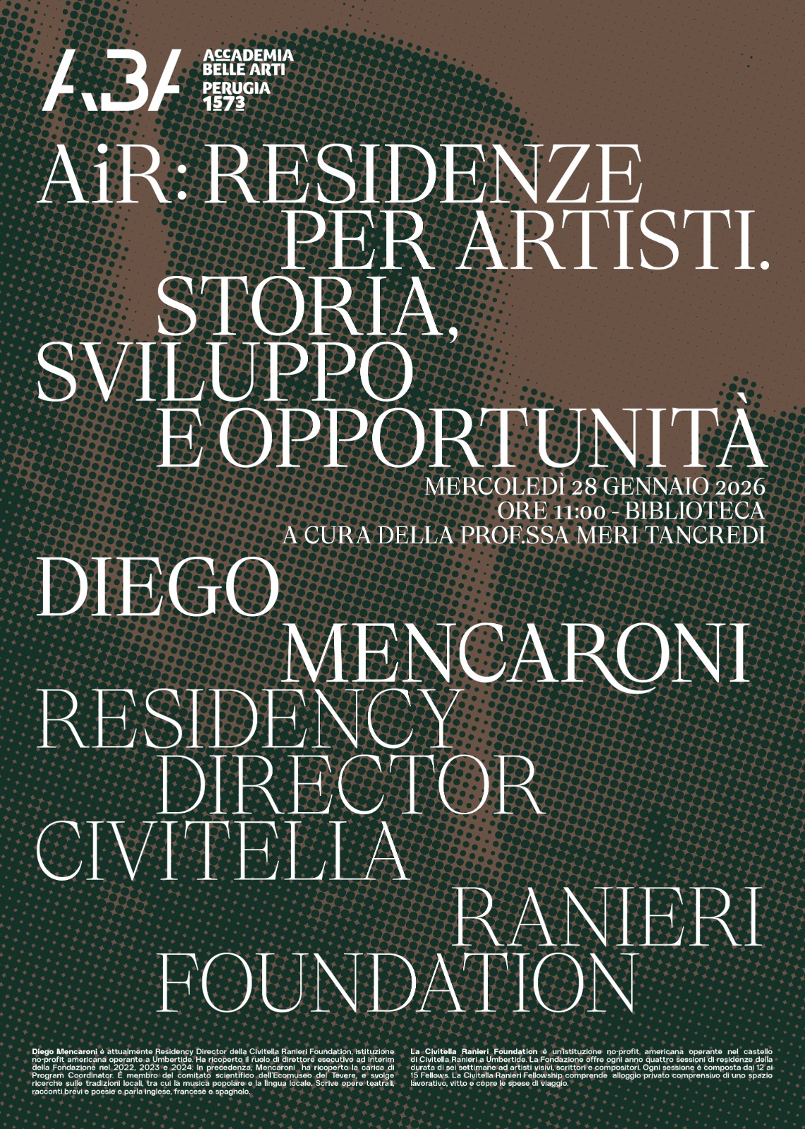 Il giorno 28 gennaio 2026 alle ore 11:00, nella Biblioteca storica dell’Accademia di Belle Arti di Perugia, si svolgerà l’incontro con Diego Mencaroni, Residency Director della Civitella Ranieri Foundation, che terrà una conferenza dal titolo “AiR: residenze per artisti. Storia, sviluppo e opportunità”, a cura della Prof.ssa Meri Tancredi.